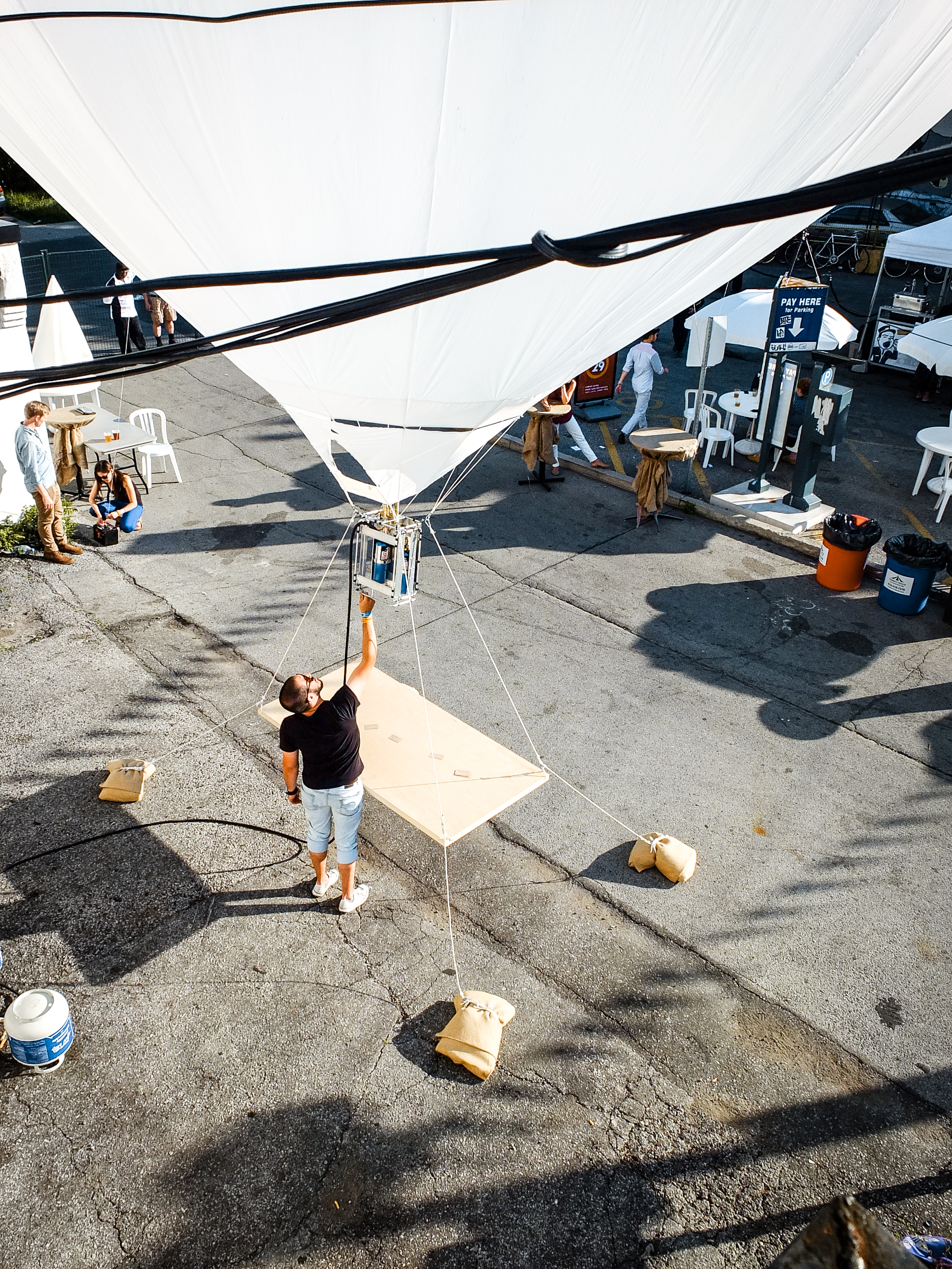 The design is comprised of a hot-air balloon, sized and constructed appropriately to carry the weight of a 3’ by 6’ worktop, food, and serving-wares. The balloon was stitched from ‘second quality’ (recycled/reclaimed) silicone fabric. The worktop began as a wicker woven over copper but was too heavy for liftoff and had to be changed to a lightweight wood.